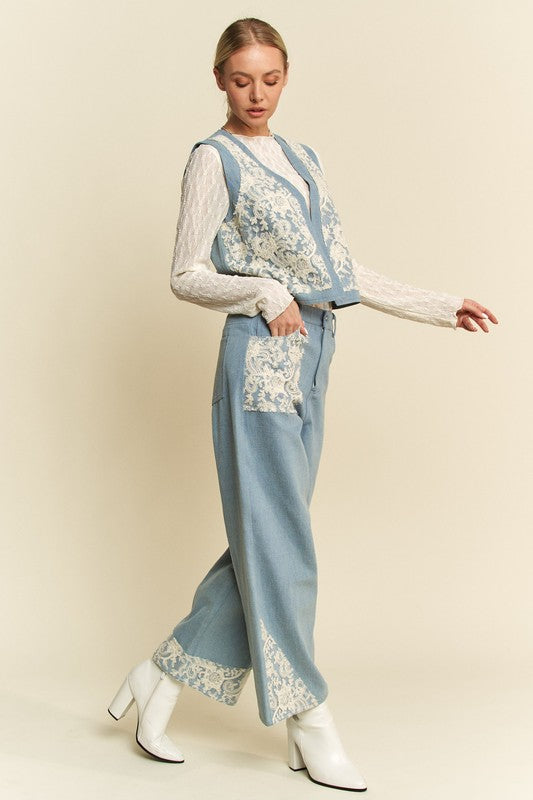 Davi & Dani Lace Patch Open Front Denim Vest